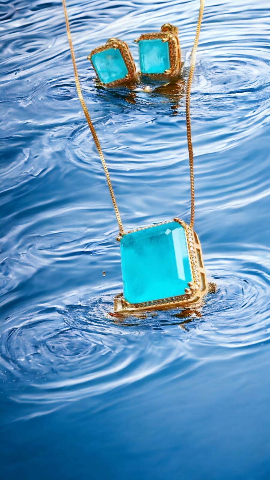 ►Conjunto banho ouro sendo o cordão em malha veneziana fina, com pingente quadrado em cristal zircônia fusion azul água ladeado de microzircônias cravejadas. Fecho lagosta e extensor com final coração. Brincos no mesmo formato e tarraxa borboleta.