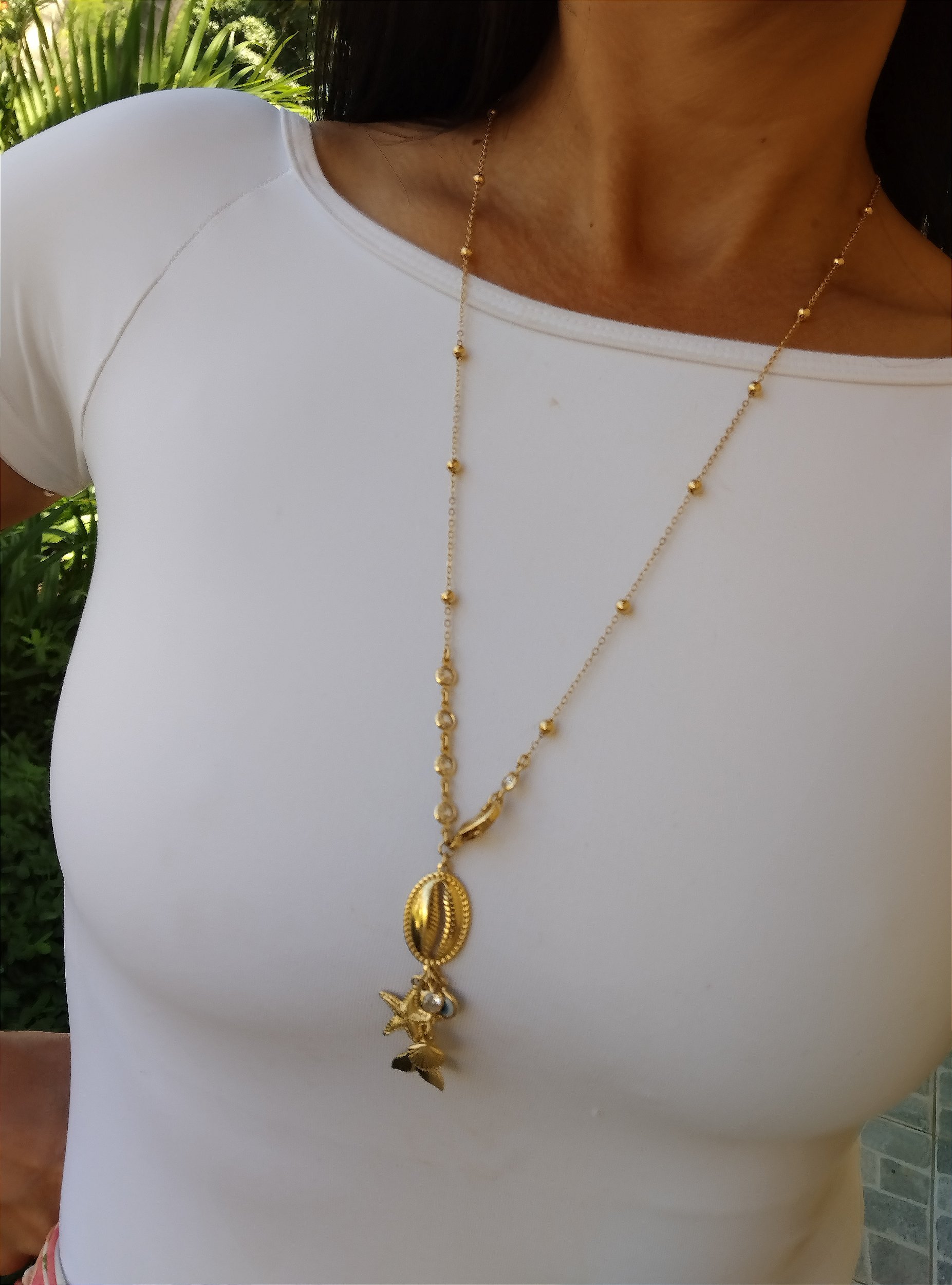 Colar longo corrente de bolinhas e cristais com berloques concha olho grego estrela do mar banhado ouro 18k