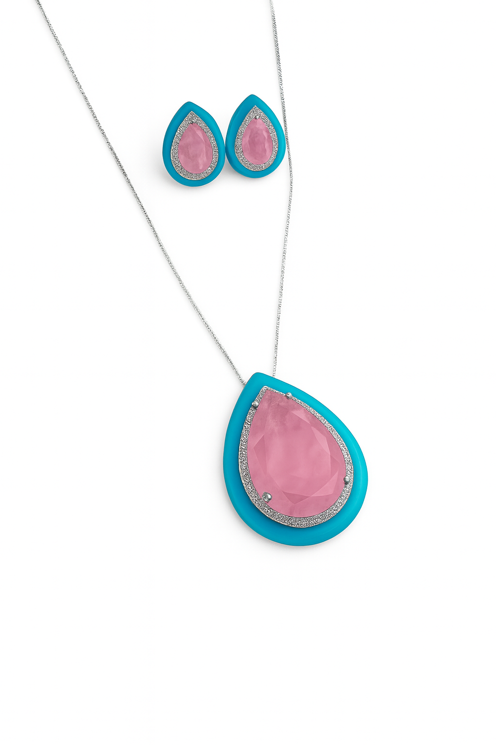 ►Conjunto em ródio branco sendo o cordão em malha veneziana fina, com pingente gota em crista zircônia fusion rosa, ladeado de microzircônias brilhantes e detalhe em resina verde aqua. Fecho lagosta com extensor. Brincos no mesmo formato do pingente e tarraxa borboleta.