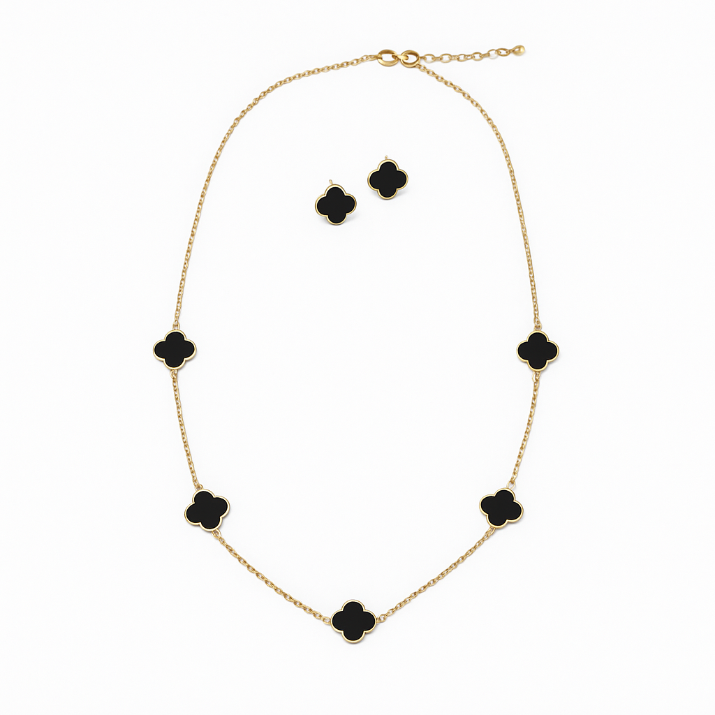 O colar possui uma corrente delicada com cinco pendentes em formato de trevo feitos com ônix de tonalidade preta. Os brincos são pequenos, também em formato de trevo, com contorno em acabamento dourado liso, proporcionando brilho sem exageros. O conjunto é leve e possui fechamento seguro, ideal para quem busca beleza e praticidade.