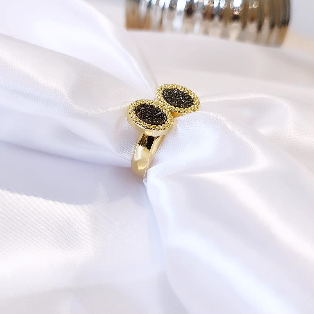Anel banhado a ouro com pedra natural Drusa Negra uma peça elegante que passa também uma sensação de seriedade por parte de quem a usa.