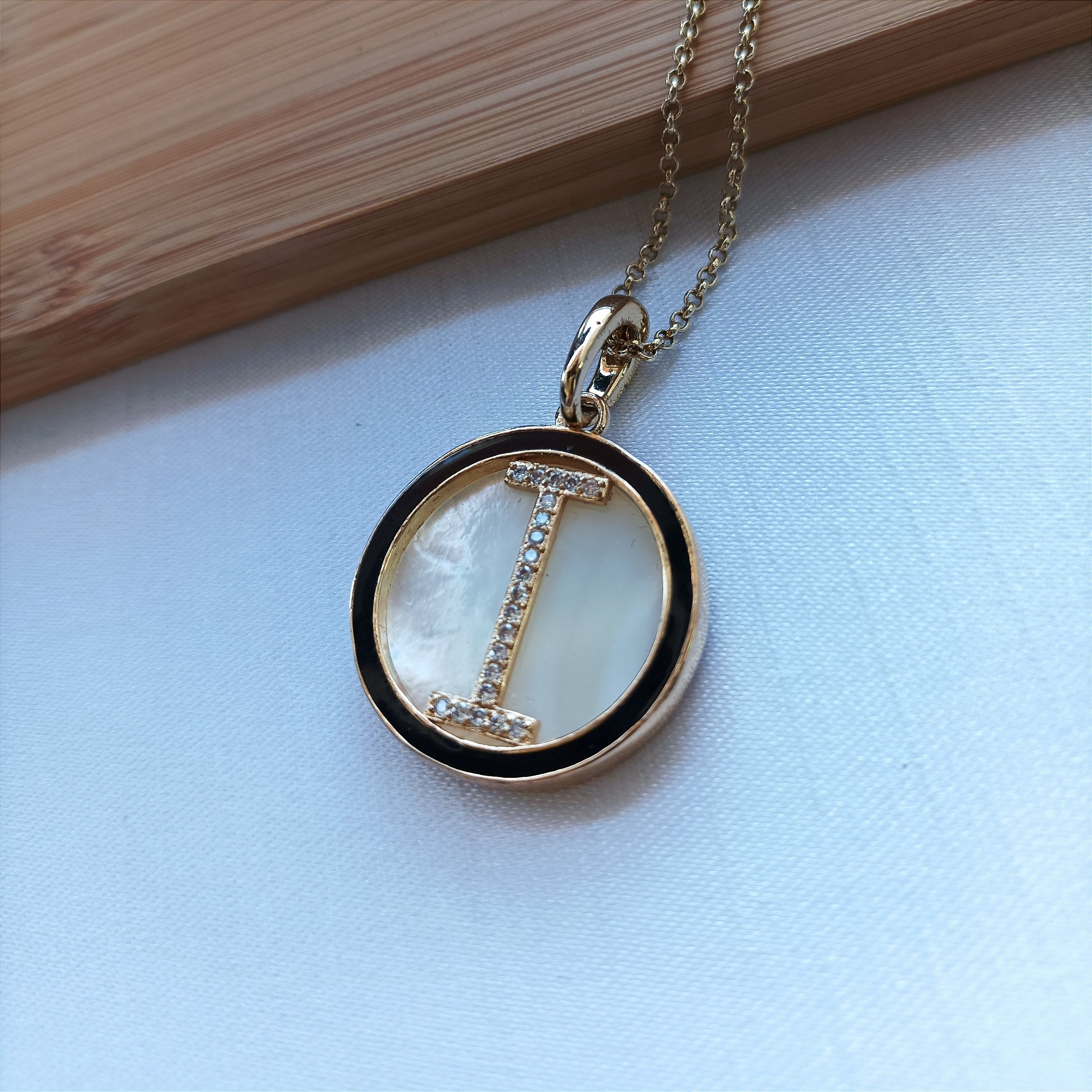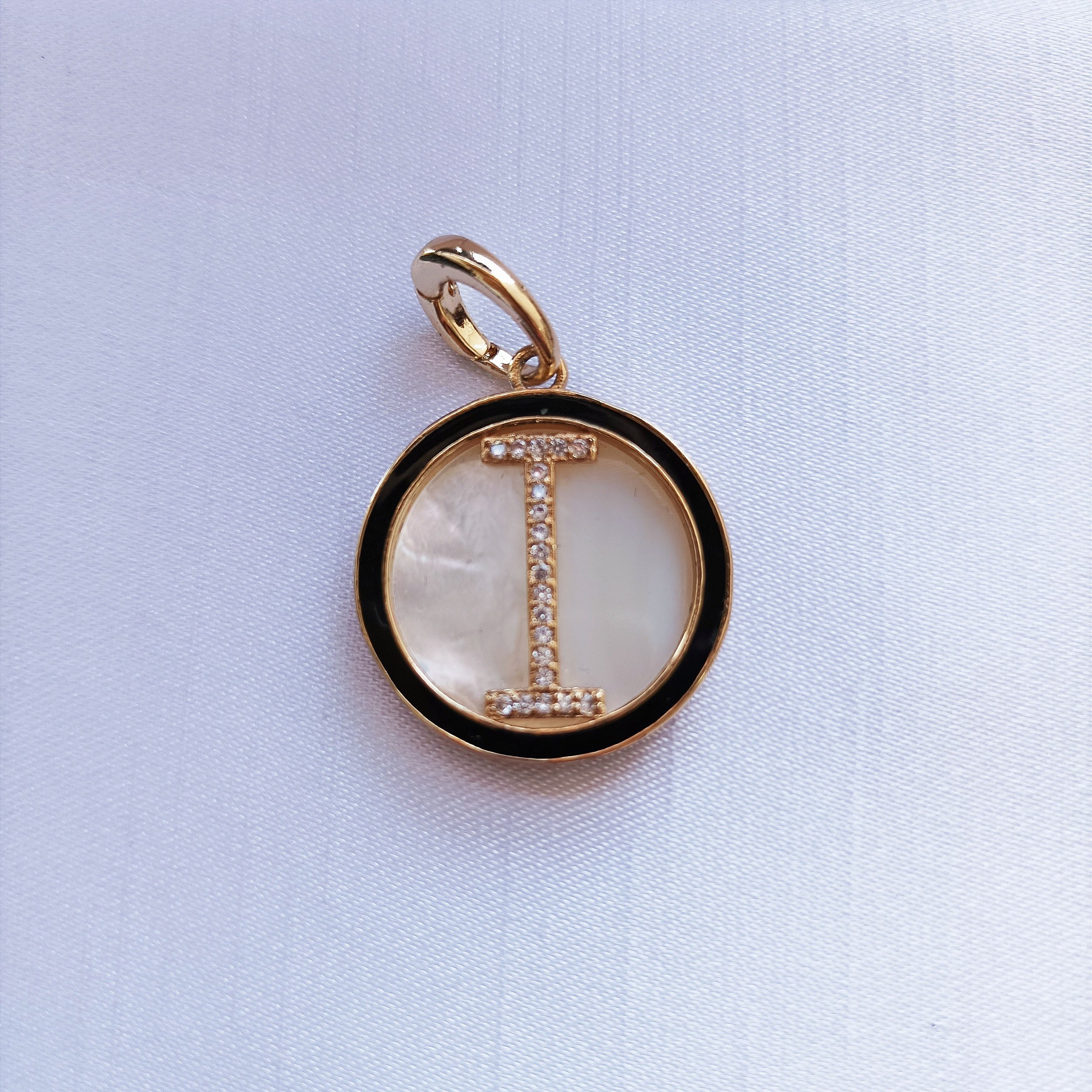 ►Peça em madrepérola, com detalhe em resina preta e cavação de microzircônias formando a letra I,banho ouro