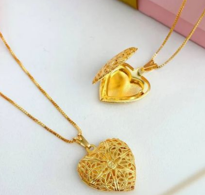 Pingente coração vazado para foto banhado a ouro 18k 2cm comp x 1,5 larg com corrente veneziana 50cm